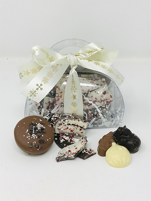• 4.75oz Dark, Milk and White holiday shape chocolate pieces